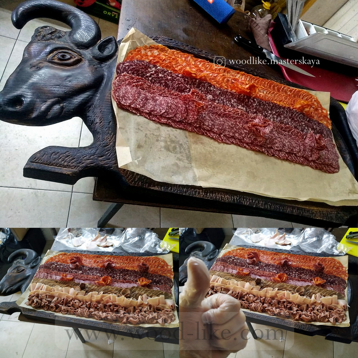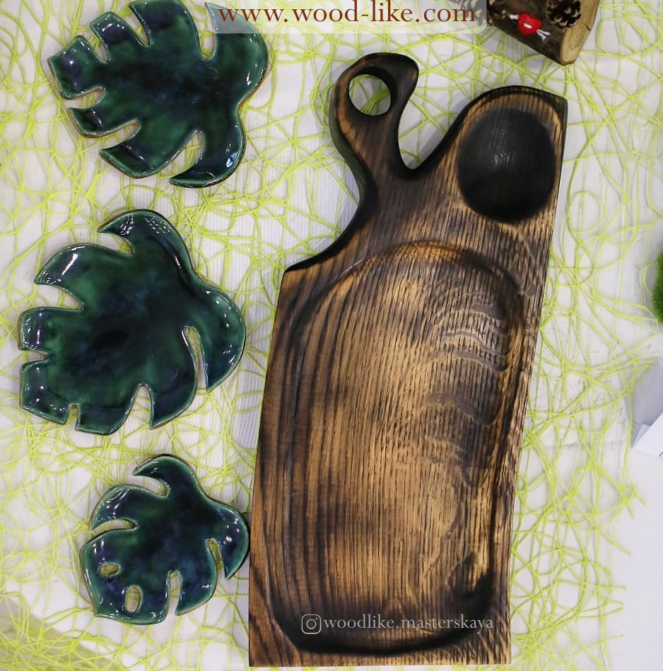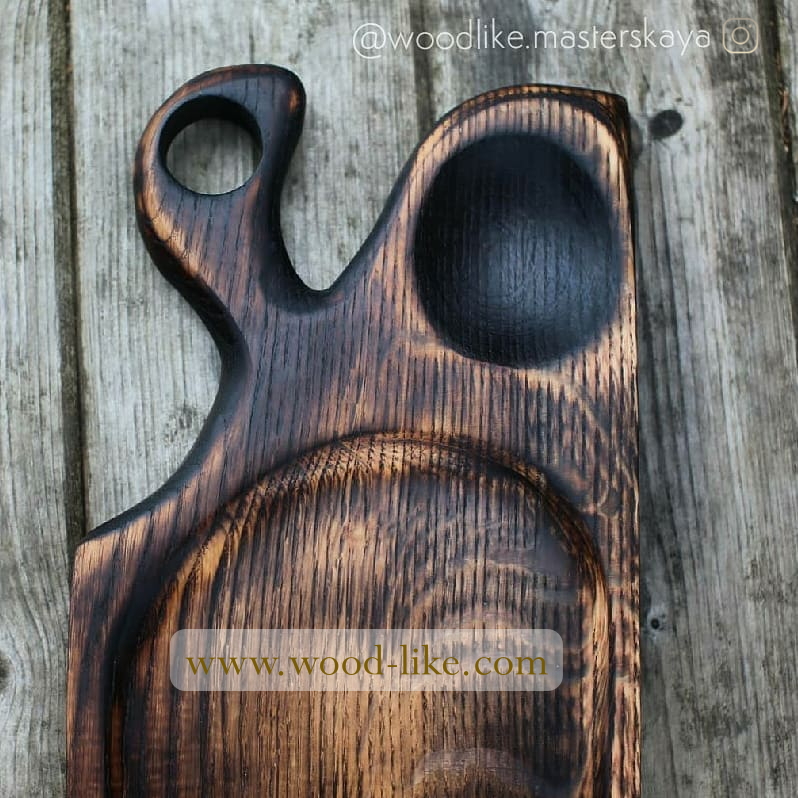 Доска для подачи с углублениями для еды и соуса. У кого уже есть в доме наши деревянные изделия, точно знают по своим ощущениям, как хочется поддерживать тему природы в интерьере и быть ближе к ней! Мы ценим и уважаем ваш выбор, поэтому предоставляем возможность определить исходный материал, конечный цвет изделия и даже при необходимости внести коррективы по форме.