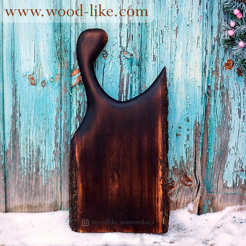 Уникальное сочетание рисунка древесины, эффектная и удобная рукоять ручной работы в форме сердца-хвоста, хорошие размеры рабочей зоны, - всё это позволяет завоевать ваше внимание и интерес к этой модели. Подбор рисунка древесины, чтобы доска имела разные цвета в своей фактуре. Цвет, размеры могут обговариваться индивидуально.