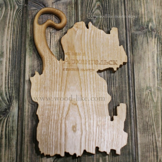 "К вам в Архангельск с песней залечу!" Любые формы, любые гравировки и размеры! Именно такие доски и должны быть в обиходе. Рукоять сделана с учетом удобства для кисти руки. Смущает гравировка? Переверните и готовьте на другой стороне, обе рабочие. На данной доске фраза с одной стороны. Хотя иногда просят и с двух. И мы всегда предлагаем и обсуждаем с вами место, которое не затрагивает совсем или по минимальной площади рабочую зону. Всем,кому надоел стандарт и кто неравнодушен к нашему формату кухонных досок и изделий, мы с удовольствием создаем изделие вашей мечты на каждый день!