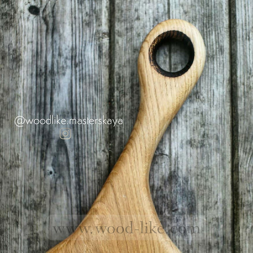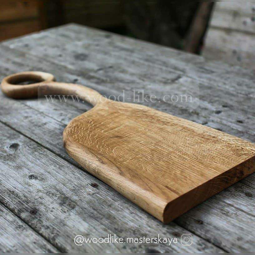 Размеры небольшие, но благодаря ручной работе из массива дуба, у нее очень эффектная и удобная рукоять. Обе поверхности готовы к контакту с едой. Можно изменить дизайн, породу дерева, размеры.